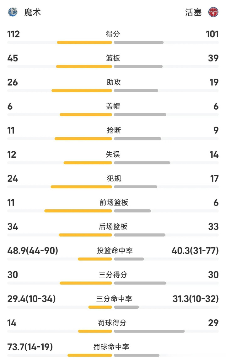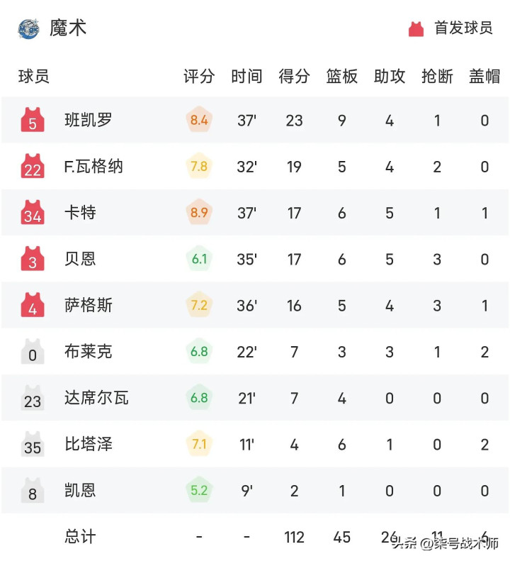 魔术(1-0):班凯罗23分9板4助、小瓦格纳19分5板4助2断、卡特17分6板5助、贝恩17分6板5助3断、萨格斯16分5板4助3断、席尔瓦7分4板、布莱克7分3板3助2帽、比塔泽4分6板1助2帽、凯恩2分1板