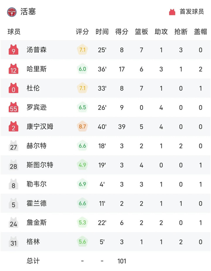 活塞(0-1):坎宁安39分5板4助、哈里斯17分6板3助2帽、罗宾逊9分4助、杜伦8分7板1助、奥萨尔8分7板1助3断、詹金斯6分2板2助、斯图尔特3分4板、勒韦尔3分3板1助、许尔特3分2板1助2断、格林3分1板1助2断、霍兰2分2板1助