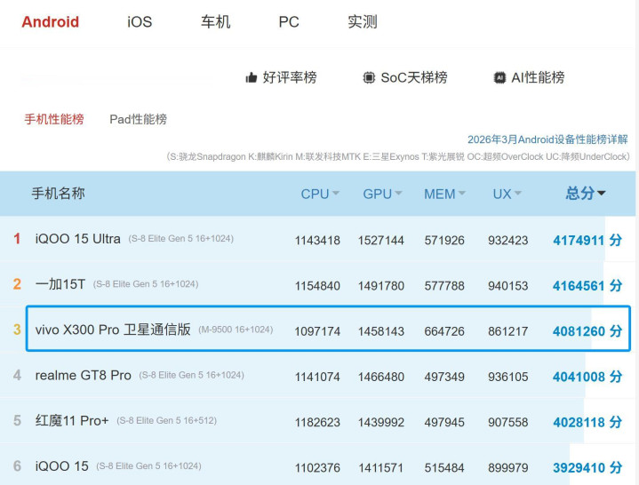 在安兔兔跑分名次榜上,搭载天玑9500的vivo X300 Pro,跑分为408万。有了电扇的加抓,征服REDMI K90至尊版会更高。