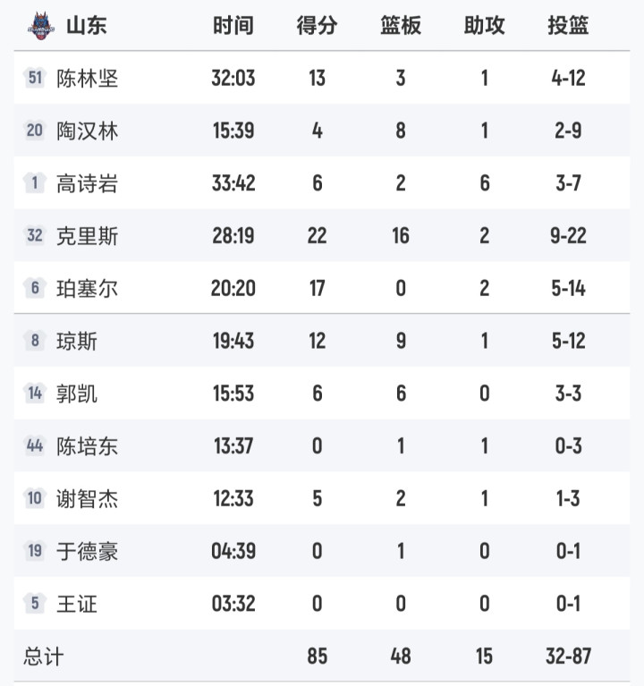 赛后球员评分与数据直不雅反应问题:克里斯22分16篮板发达亮眼,获评9.2分,是全队独一亮点;陈林坚掷中3记三分,孝顺13分,拿到7.5分;琼斯12分9篮板,发达中规中矩。高诗岩仅得6分6助攻,攻防两头孝顺有限,评分5.2。陶汉林9投2中仅得4分8篮板,内线总揽力不及,评分4.8。