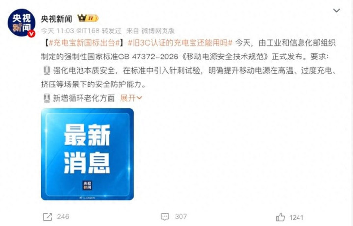 当天上昼,工信部庄重发布强制性国度设施GB 47372-2026《出动电源安全时刻轨范》,并树立12 个月过渡期,2027 年 4 月 1 日起全面强制延伸,出动电源行业将迎来史上最严安全监管。