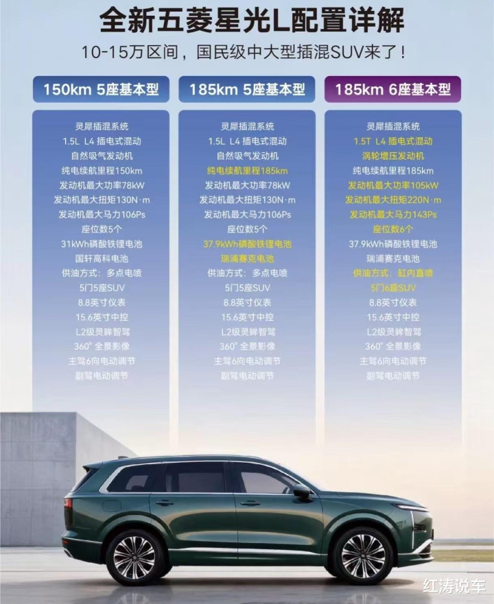 五菱星光L搭载1.5L插混和1.5T插混能源,其中1.5L发动机最大功率为78千瓦,最大扭矩130牛·米,电机功率暂未公布,将匹配容量为31千瓦时的磷酸铁锂电板,纯电续航里程150公里,1.5T发动机最大功率为105千瓦,最大扭矩为220牛·米,电机功率未知,匹配37.9千瓦时的磷酸铁锂电板,纯电续航里程185公里(以上市公布信息为准)。