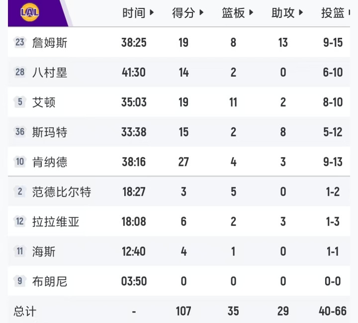 湖东说念主队:肯纳德27分4板3助、艾顿19分11板2助、詹姆斯19分8板13助2断、斯玛特15分2板8助2帽、八村墨14分2板3断2帽、拉拉维亚6分2板3助、海斯4分1板、范德比尔特3分5板
