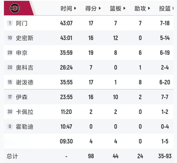火箭队:申京19分8板6助2断、阿门17分7板7助2断、谢泼德17分1板8助、史姑娘16分12板2断、伊森16分10板2助3断、奥科吉7分1助2断、泰特4分4板、卡佩拉2分2板