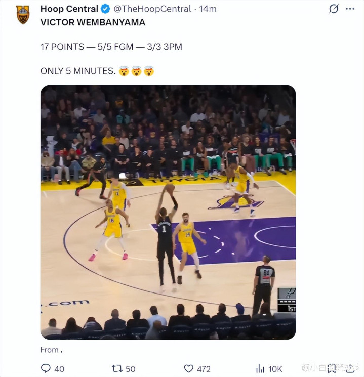 开场文班亚马短短5分钟里就5中5,三分3中3,拿到17分,克勒贝尔在文班亚马的身前像个小学生,文班亚马一人就锤爆了湖人全队。