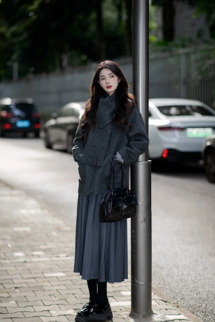 诚然若是对于颜色把控不好的宝子们,也不错尝试一下同色系穿搭,深灰色毛呢短外衣搭配灰色百褶半身裙,顺色搭配检朴高档,配饰吸收玄色包包,玄色打底裤配玄色乐福鞋,简浅近单又显高档的穿搭。
