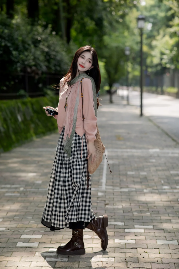 淡粉色毛衣与诟谇格纹半身裙组合,格纹元素自己自带因循,再衔尾一对深棕色皮质马丁靴,举座气质和煦又因循,若是再合作一头波澜鬈发,妥妥的港习惯质女神。