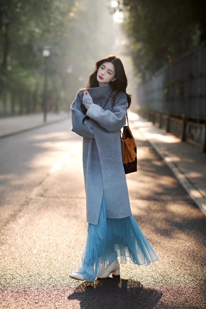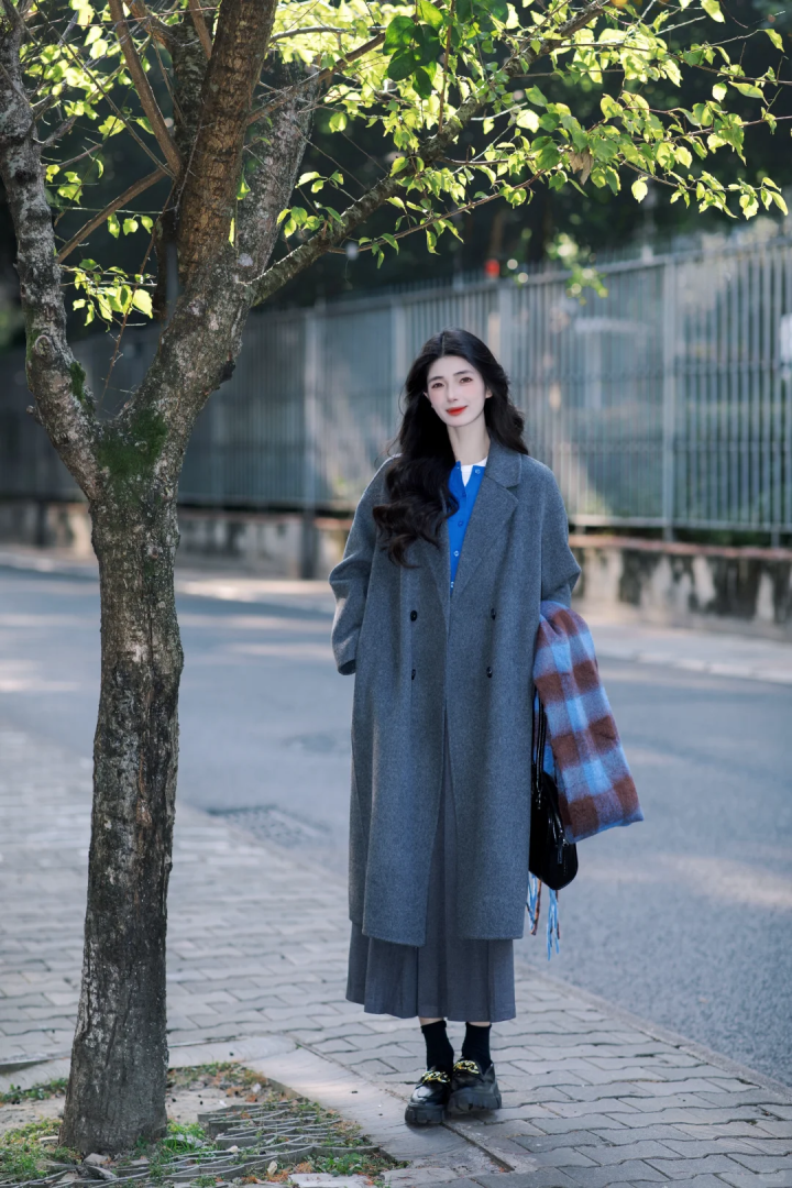 灰色的H版型长款大衣,搭配灰色百褶半身裙,基础色搭配其实莫得那么难,内搭一件宝蓝色竭诚衫叠穿白色T恤打底,举座造型呈现出一种高档又不构怨煦感的气质,内搭的边幅提亮造型又衬肤色,若是再搭配一条格纹领巾,妥妥的春季氛围感穿搭。