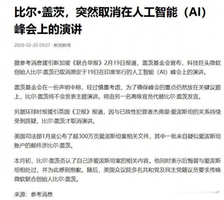 2026年2月,一则不详声明在科技圈炸开:比尔·盖茨取消AI峰会演讲。