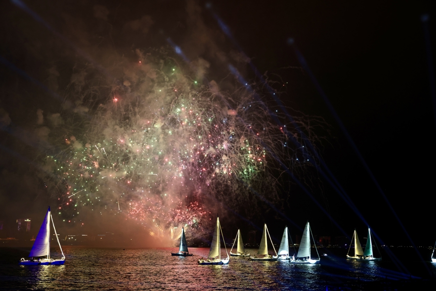 本年开赛庆典上,风帆巡游、童声齐唱、时光之戒光影秀、艳丽烟花交汇成画,水岸和谐、流光溢彩。赛事窜改打造环湖全景不雅赛体系。除官方滴水湖南岛不雅赛点外,新增荣耀之环不雅赛点,360°俯视滴水湖全景,百舸争流与当代建筑同框出片。同期通达环湖解放不雅赛点位,搭配同期献艺的环湖楼宇光影秀,水岸和谐、光影与帆影交相照映。