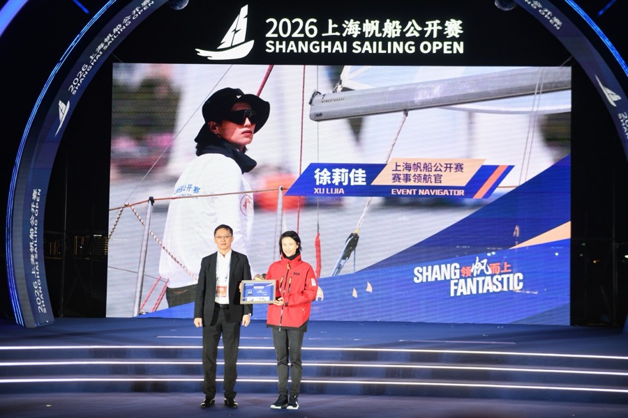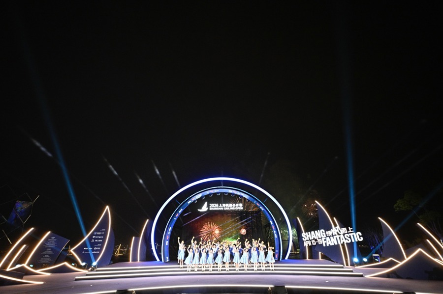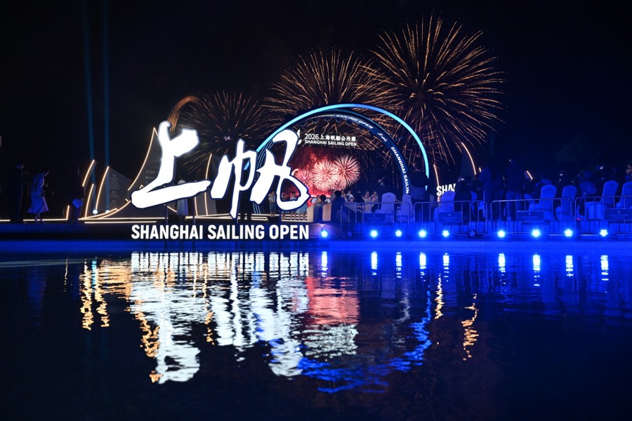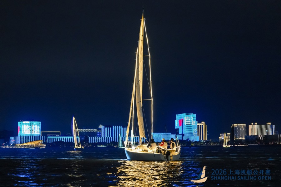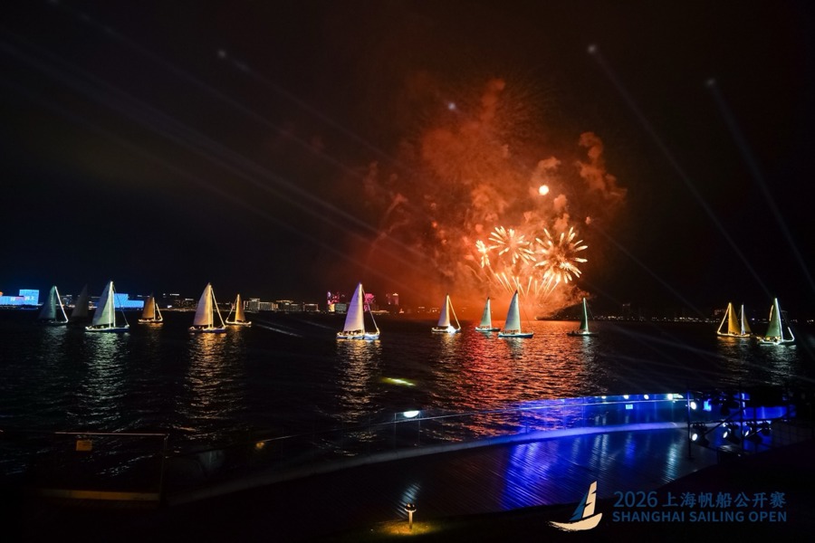 临港滴水湖的夜景,繁多点缀着灯光的风帆入水巡游,环湖建筑群与湖面联动的光影烟花秀……在这幕新鲜的场景中,2026上海风帆公开赛(以下简称“上帆”)于4月15日晚开幕,并将在之后三天的滴水湖上扬帆竞逐。