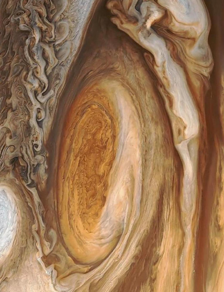 如若说木星的条纹是这幅天地画作的主体,那么大红斑便是画中最引东说念主防卫的焦点。这个位于木星南纬22度隔邻的大型风暴,是太阳系中已知最大、最龟龄的风暴系统,仍是淡漠了至少两百年,以至可能长达三百多年。
